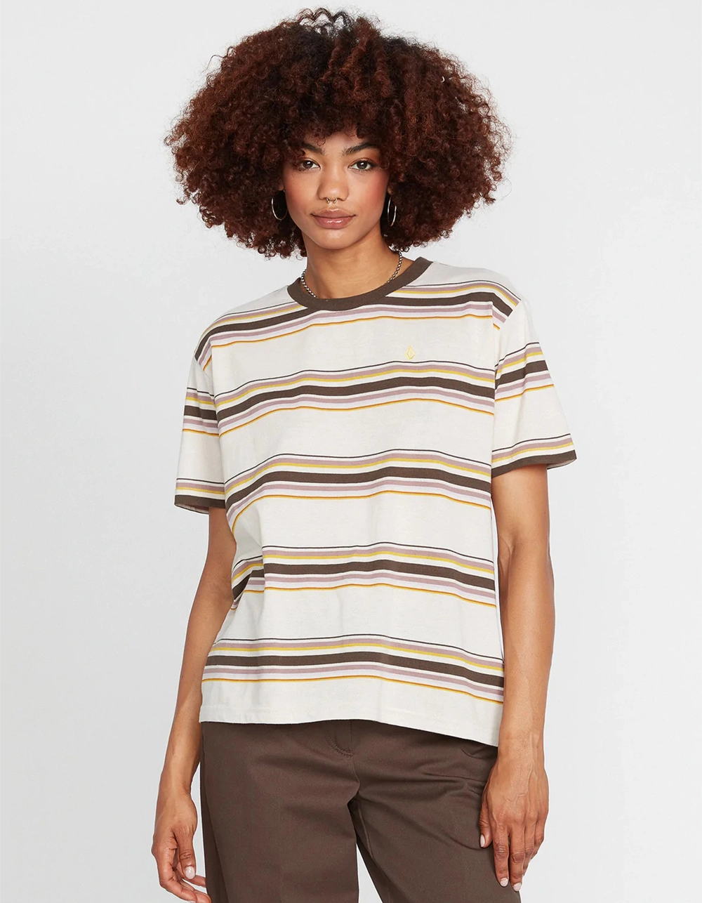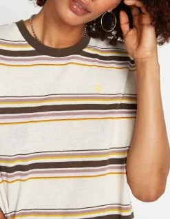 Volcom Party Pack Tee. Classic styles don’t have to be stuffy. Made from a supremely soft blend of virgin cotton and recycled polyester jersey, this striped short sleeve tee packs a load of comfort and everyday wearability. HPS 25″. 60% Virgin Cotton / 40% Recycled Polyester Jersey, 175GSM. Short sleeve boyfriend fit tee with contrast rib neckband. Stripe screen printed interior neck taping. Stone embroidery at chest. Imported.