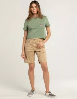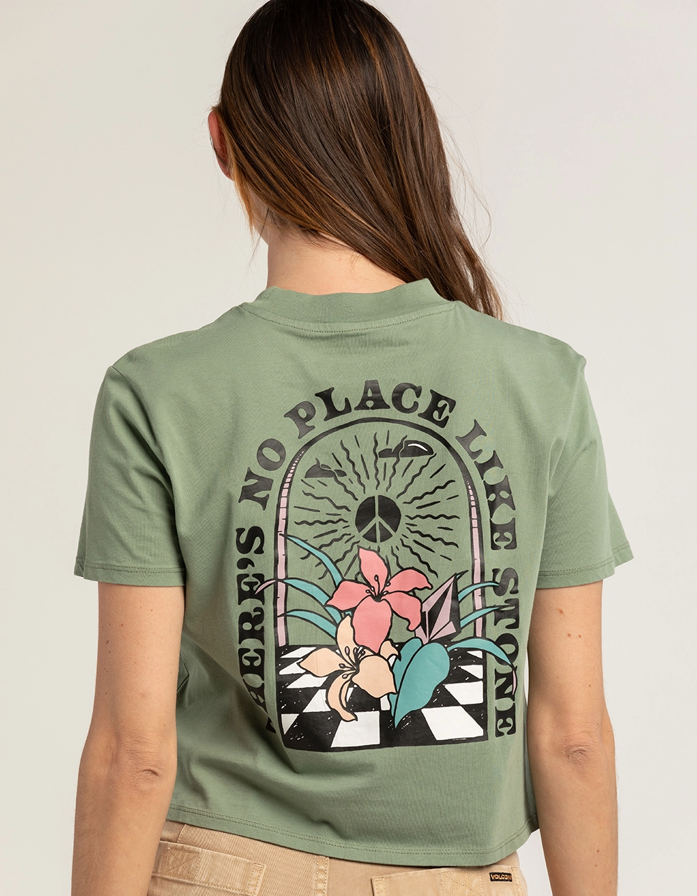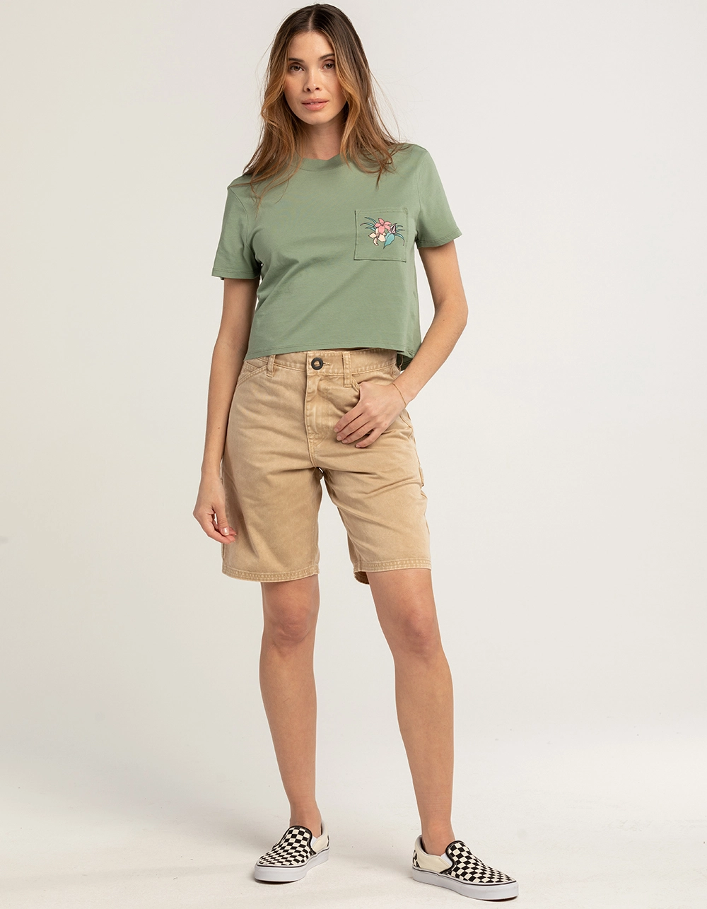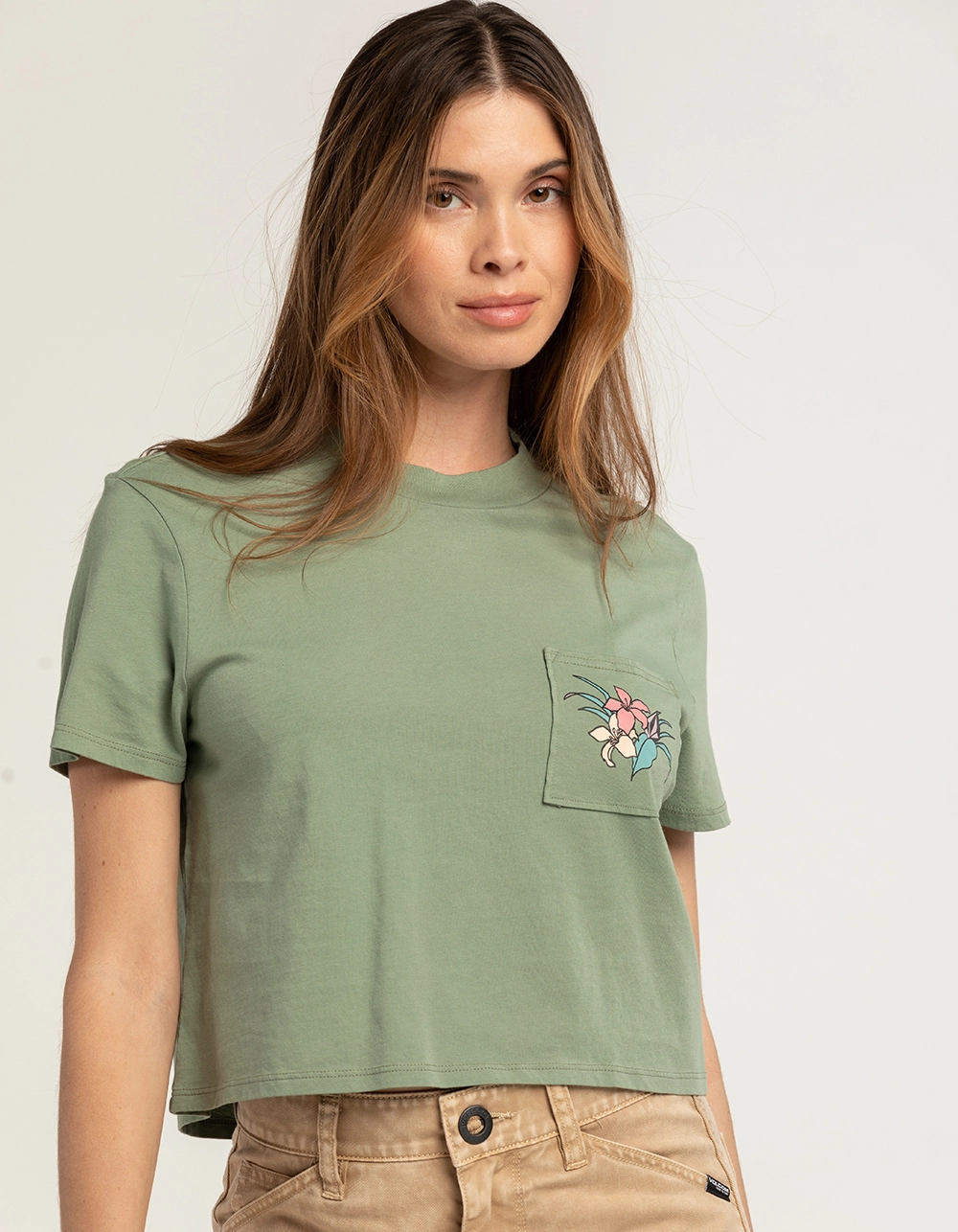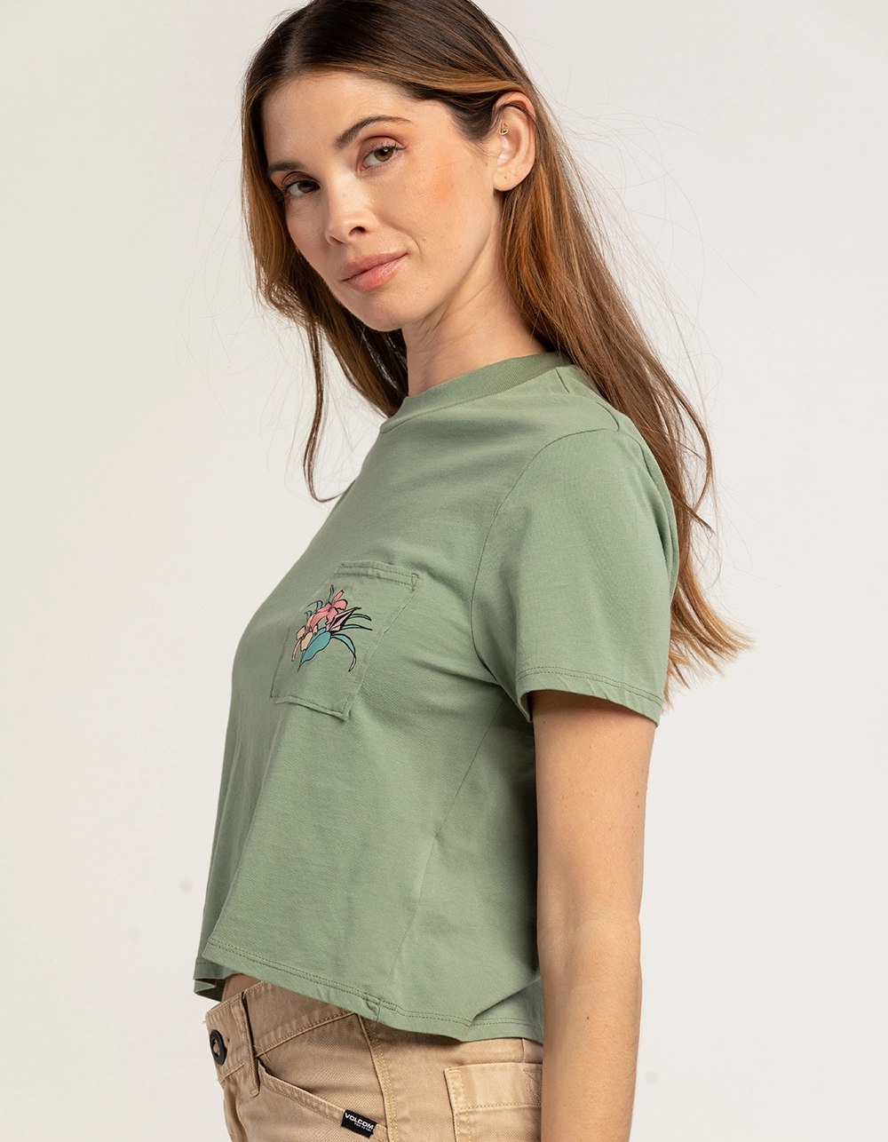 Volcom Pocket Crop Tee. Patch pocket on left chest with floral graphic. Large graphic on back. Ribbed crew neckline. Short sleeve. Cropped fit. 100% Cotton. Machine wash. Imported.