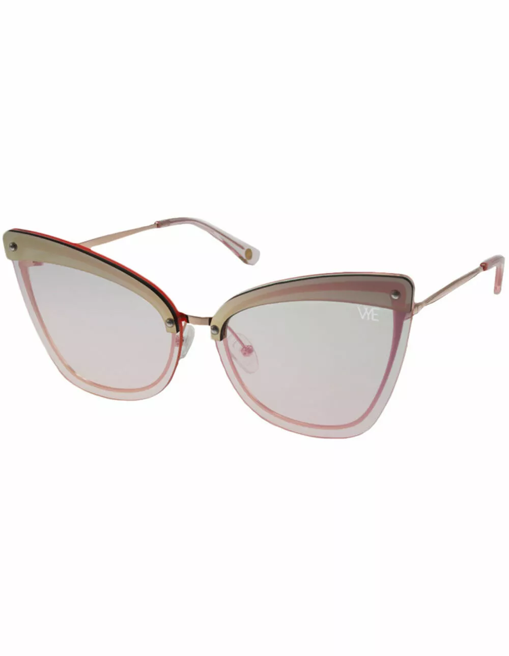 VYE Extreme Queen Sunglasses. Eccentric is our go to! Although this collection is meant for everyday use, VYE could not resist the urge to put a more bold style in the collection. Extreme Queen features a double lens with coordinating tones that subdues the bold frame. Rose gold accents. Mirror lens. Stainless Steel. 100% UV Protection. Measurements: 66 – 13 – 145 mm. Imported.