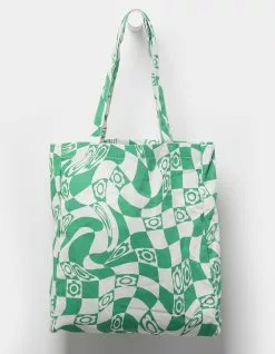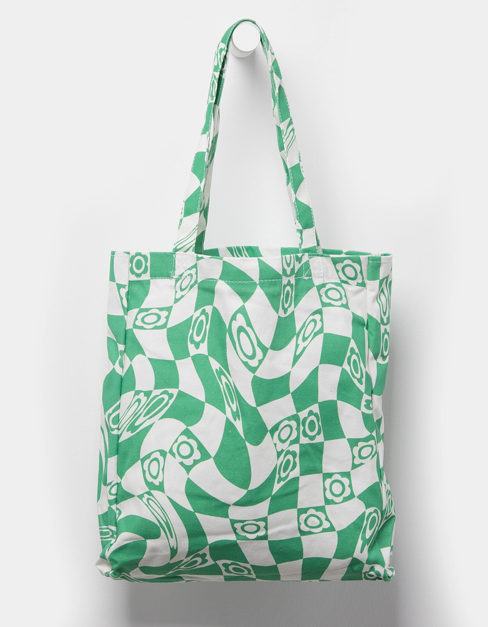Warped Flower Tote Bag. All over pattern. Canvas tote bag. Fixed straps. 3.25″ x 12.5″ x 16″. Imported.