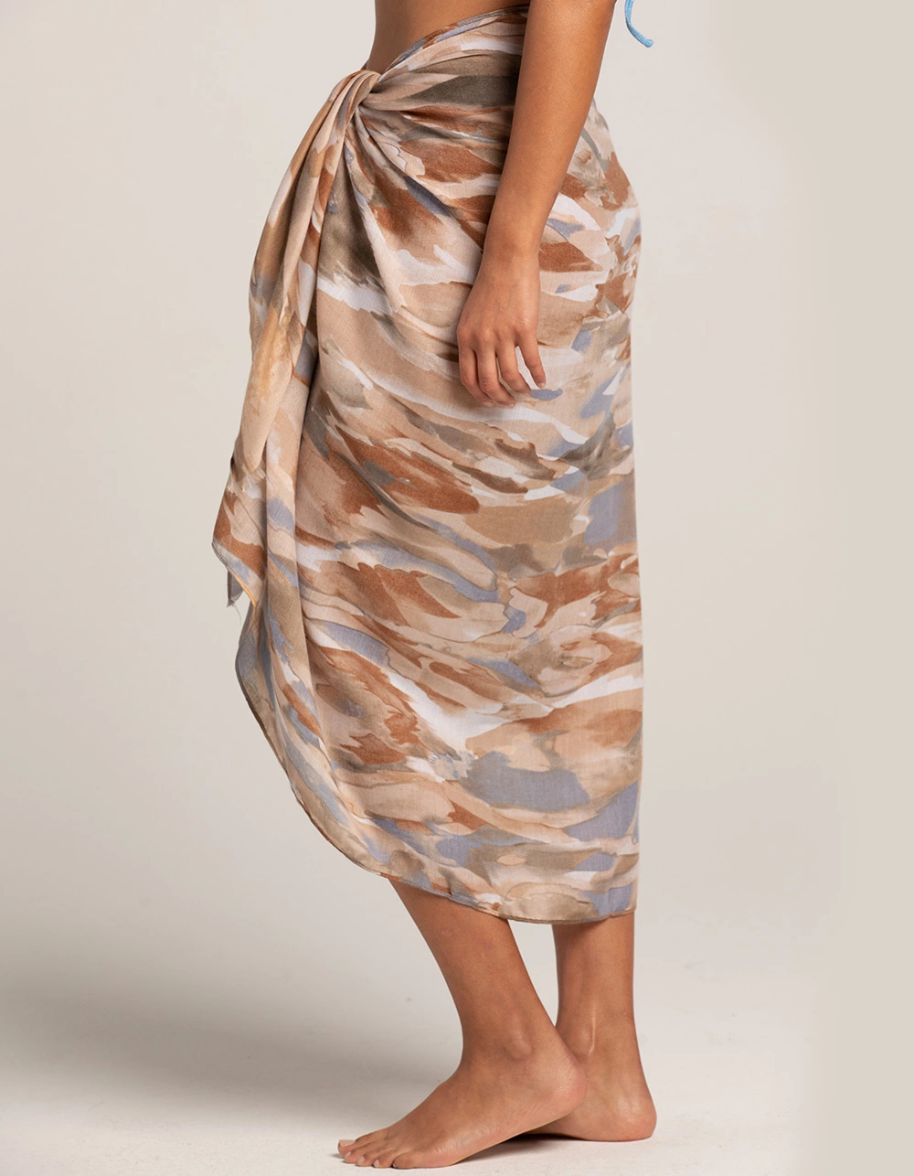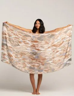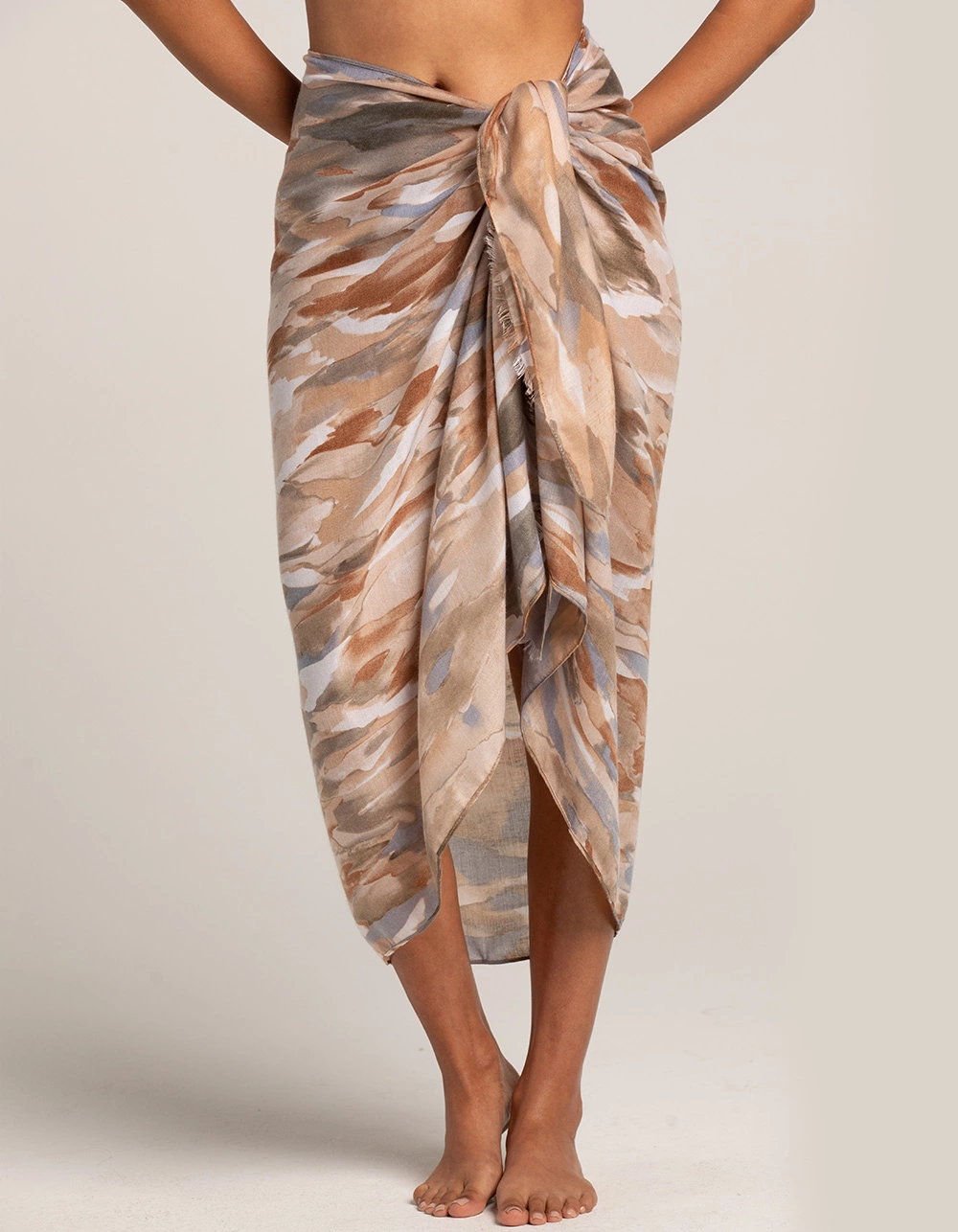 Watercolor Print Sarong And Scarf. A versatile staple for the summer. Allover multi color print. Doubles as a scarf and a sarong. Finished with a frayed hem. 100% Polyester. Machine wash. Imported.
