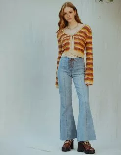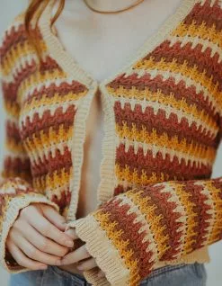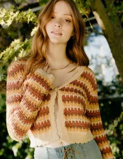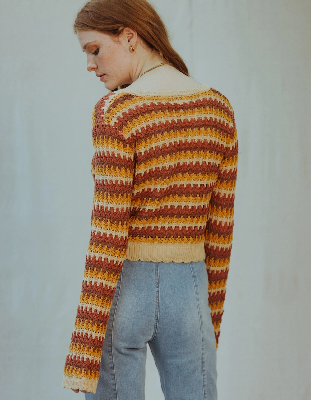 West Of Melrose Crochet Stripe Sweater. V-neckline. Scalloped long sleeves and hem line. Button closure at front. 100% Cotton. Machine wash. Imported.