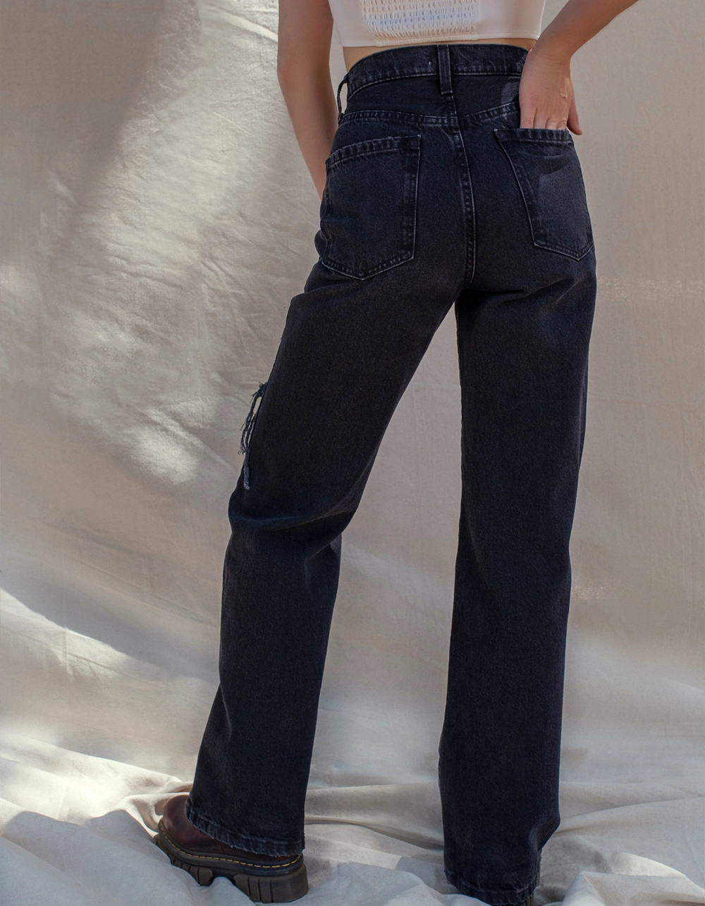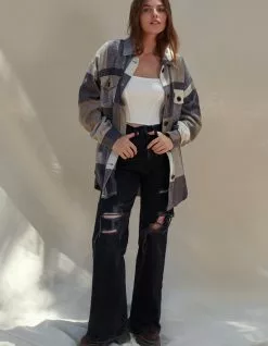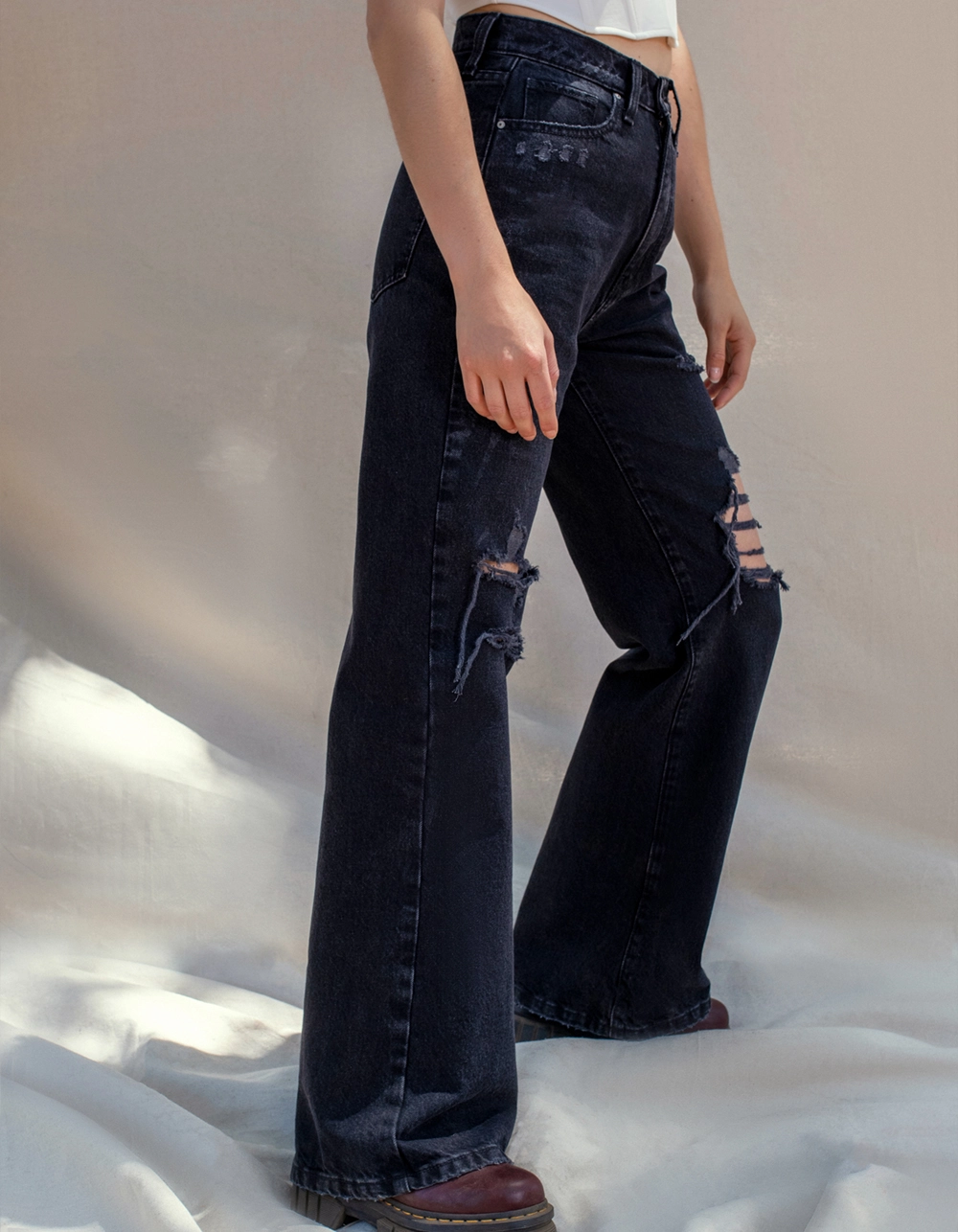 West Of Melrose Destructed Wide Leg Jeans. Belt loop waist. Button closure paired with zipper fly. Traditional 5 pocket design. Wide leg. Custom destructed details on. Approx. inseam: 32.5″. 100% Cotton. Machine wash. Imported.