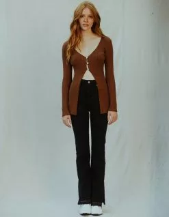 West of Melrose Flyaway Sweater. Ribbed fabrication. V-Neckline. Partial button down front. Long sleeve. 70% Viscose, 30% Polyester. Hand wash. Imported.