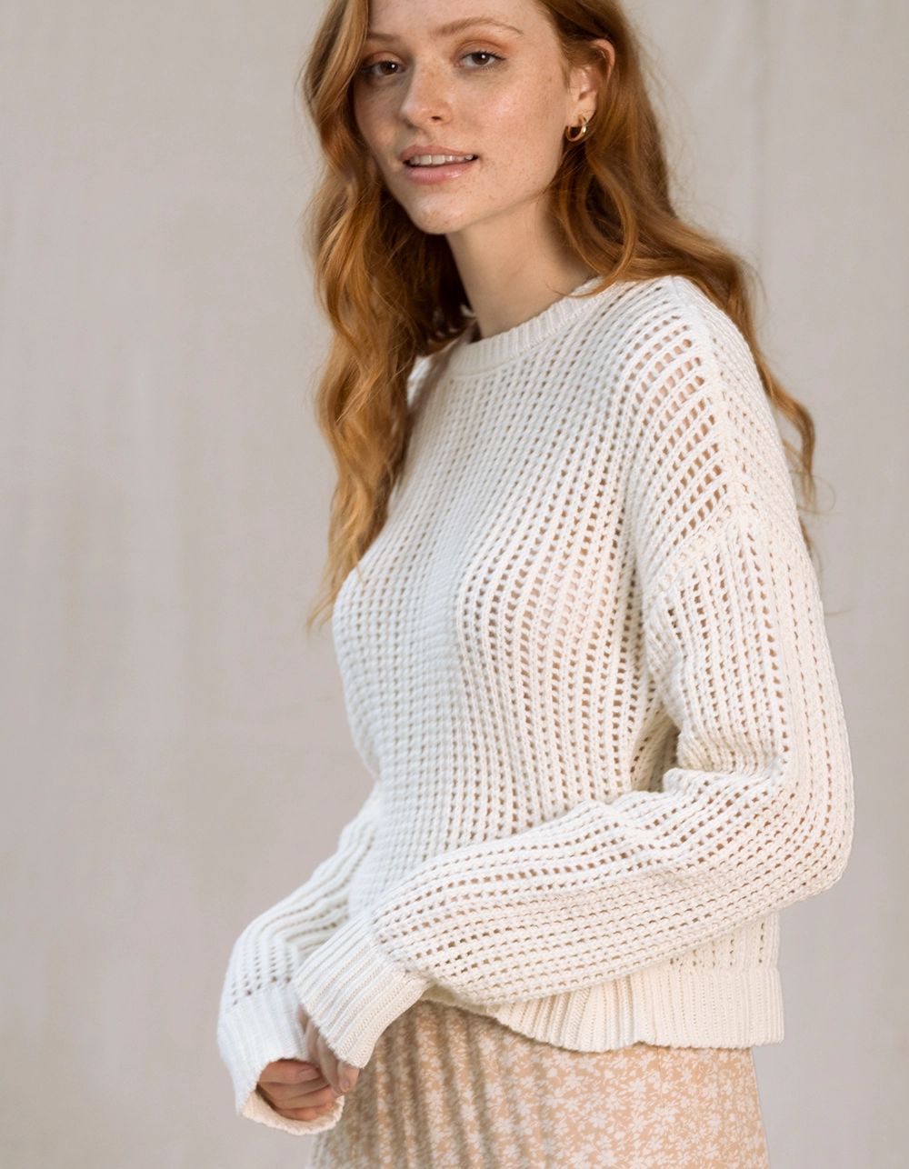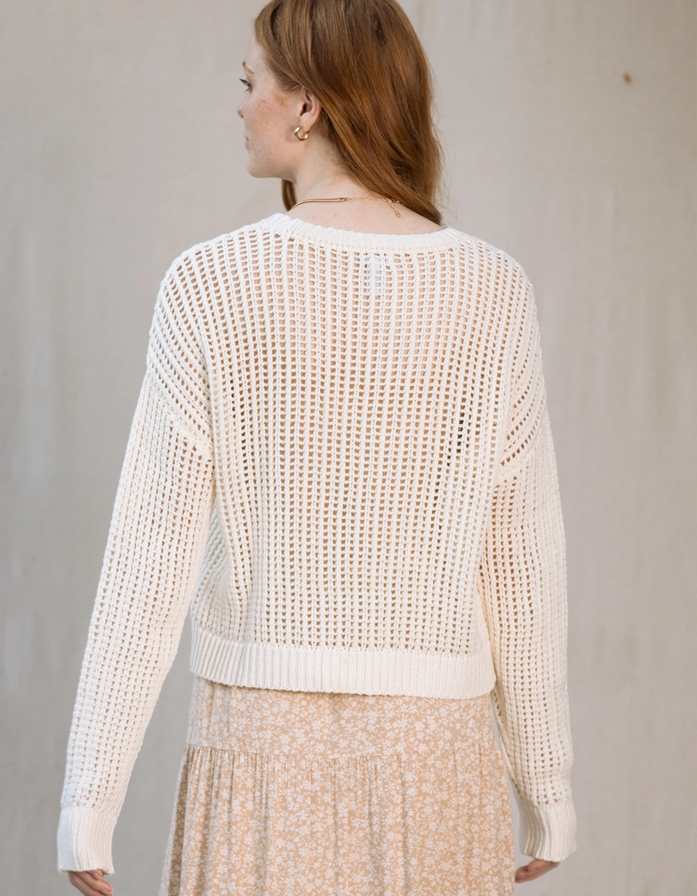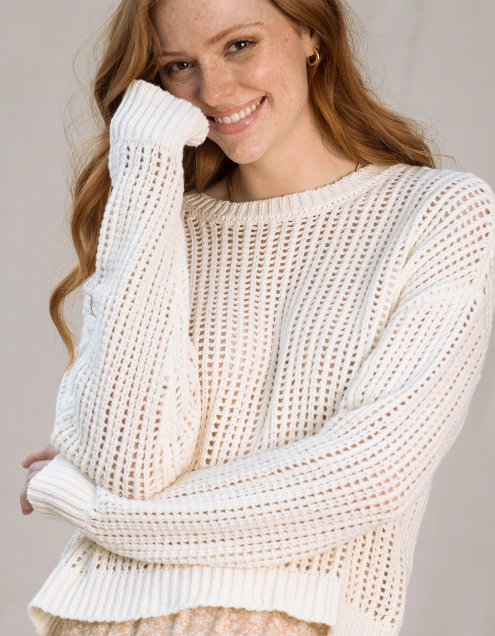 West Of Melrose Open Weave Sweater. Scoop neckline. Rib cuffed long sleeves and hem. See through open weave construction. 55% Cotton, 45% Acrylic. Machine wash. Imported.