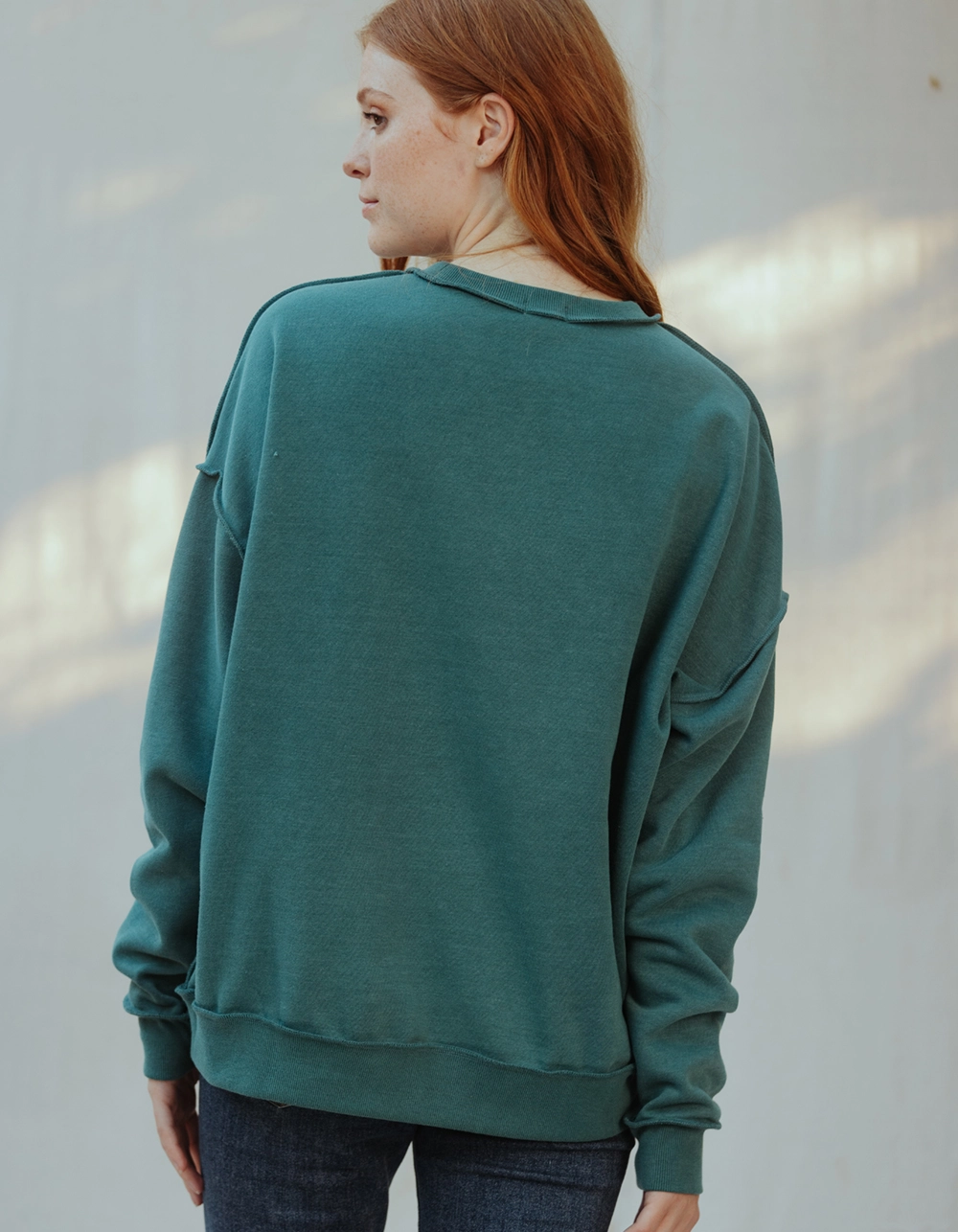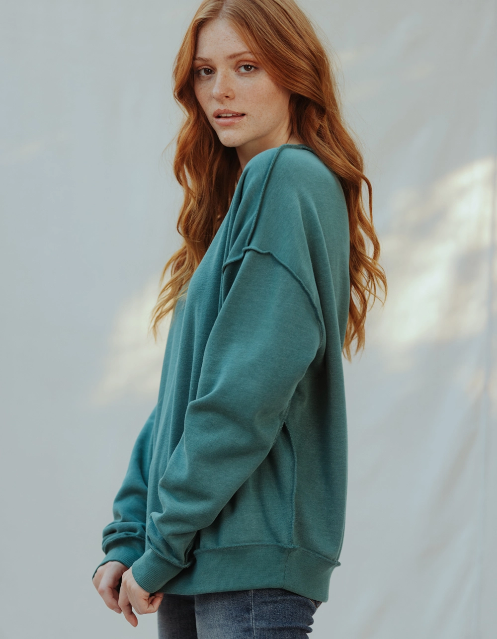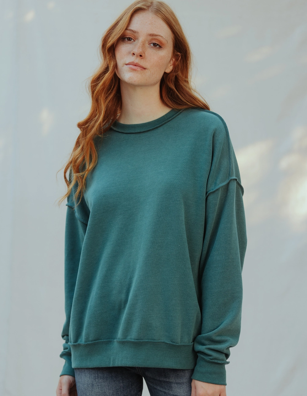 West Of Melrose Reversed Stich Overdyed Crewneck Sweatshirt. Overdyed solid color. Reversed Stitch detail. Cuffed long sleeves and hem. Ribbed crew neckline. Long sleeves. 60% Cotton 40% Polyester. Machine wash. Imported.