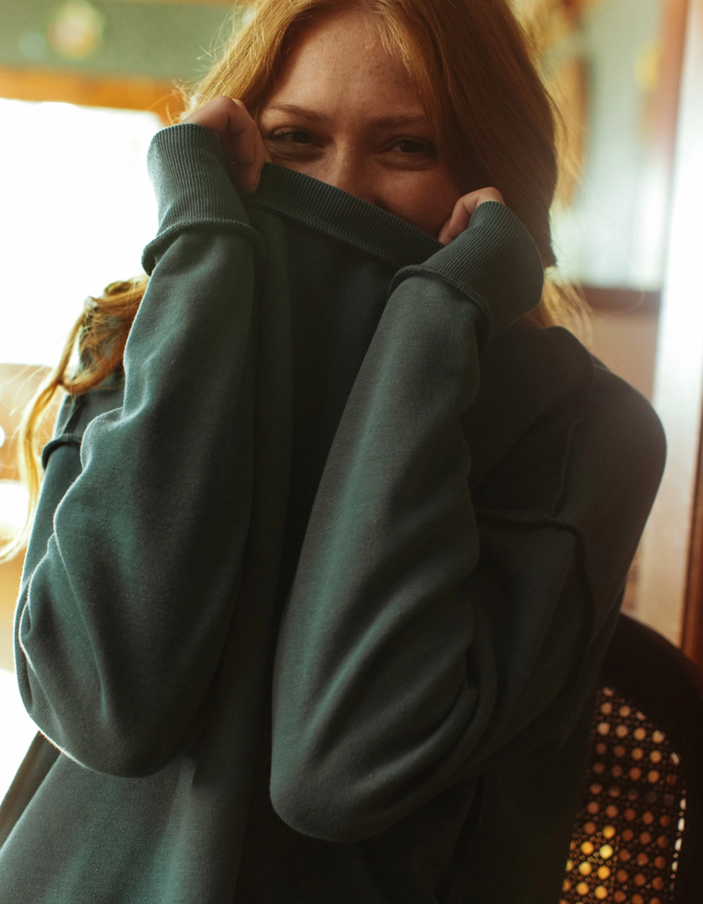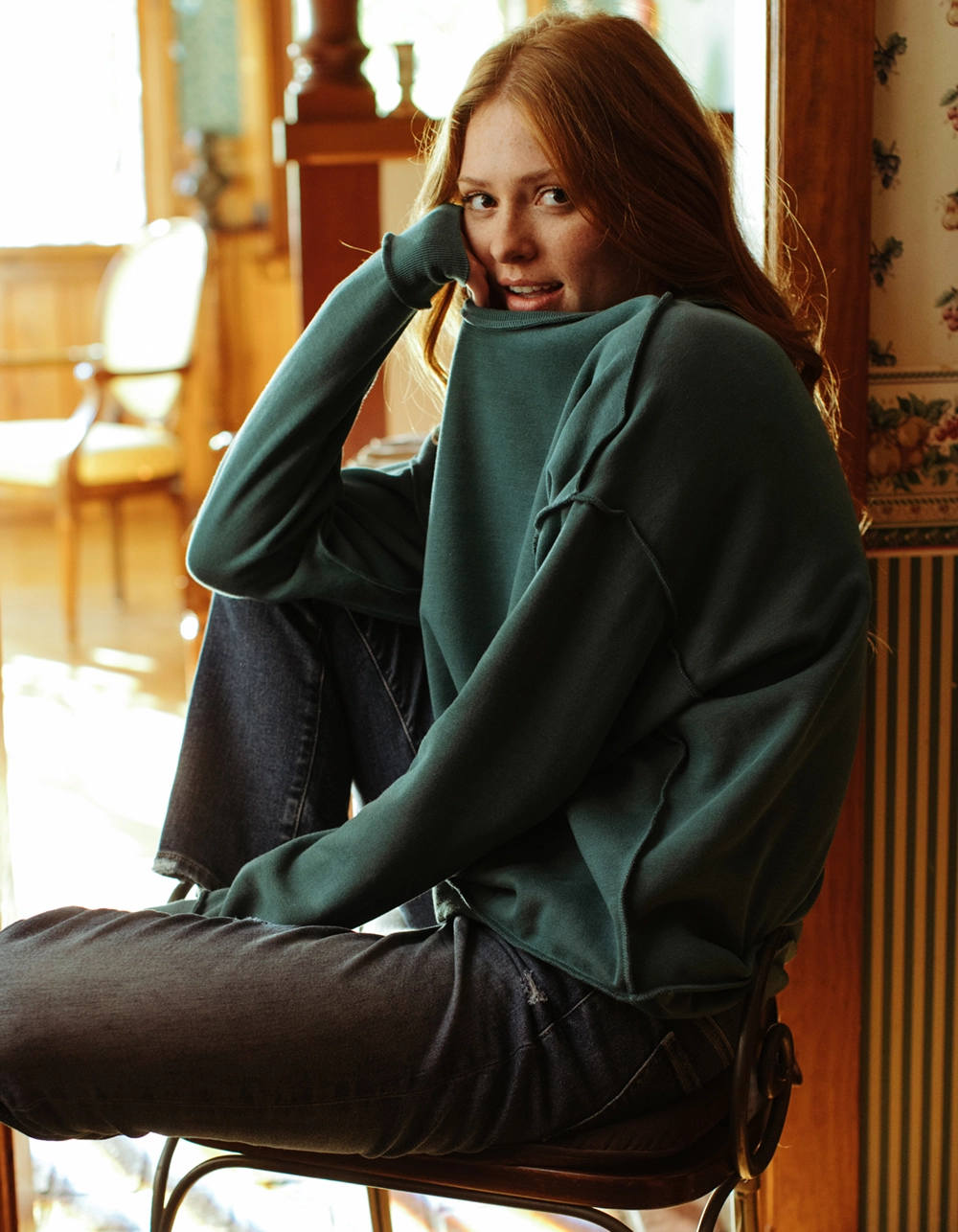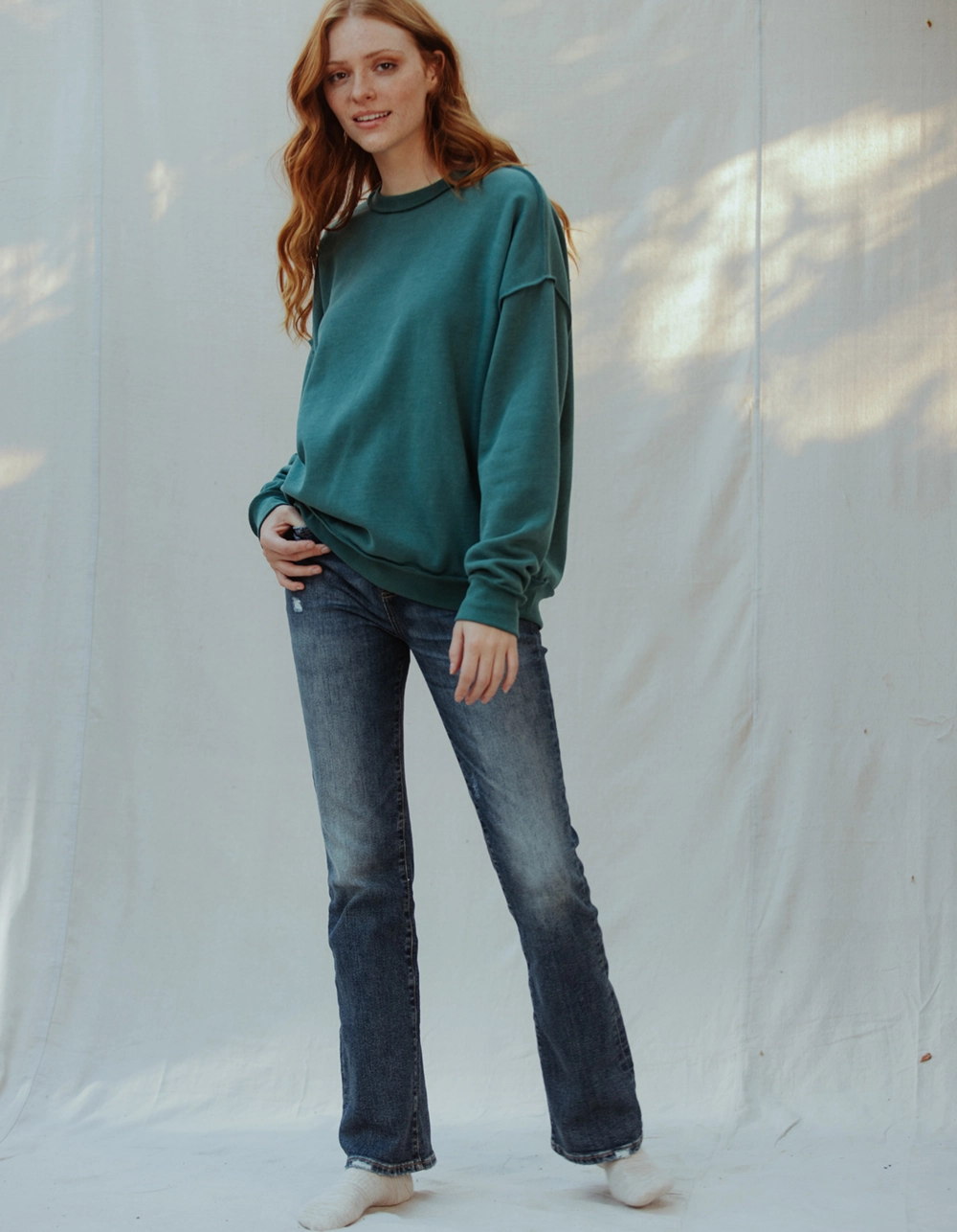 West Of Melrose Reversed Stich Overdyed Crewneck Sweatshirt. Overdyed solid color. Reversed Stitch detail. Cuffed long sleeves and hem. Ribbed crew neckline. Long sleeves. 60% Cotton 40% Polyester. Machine wash. Imported.