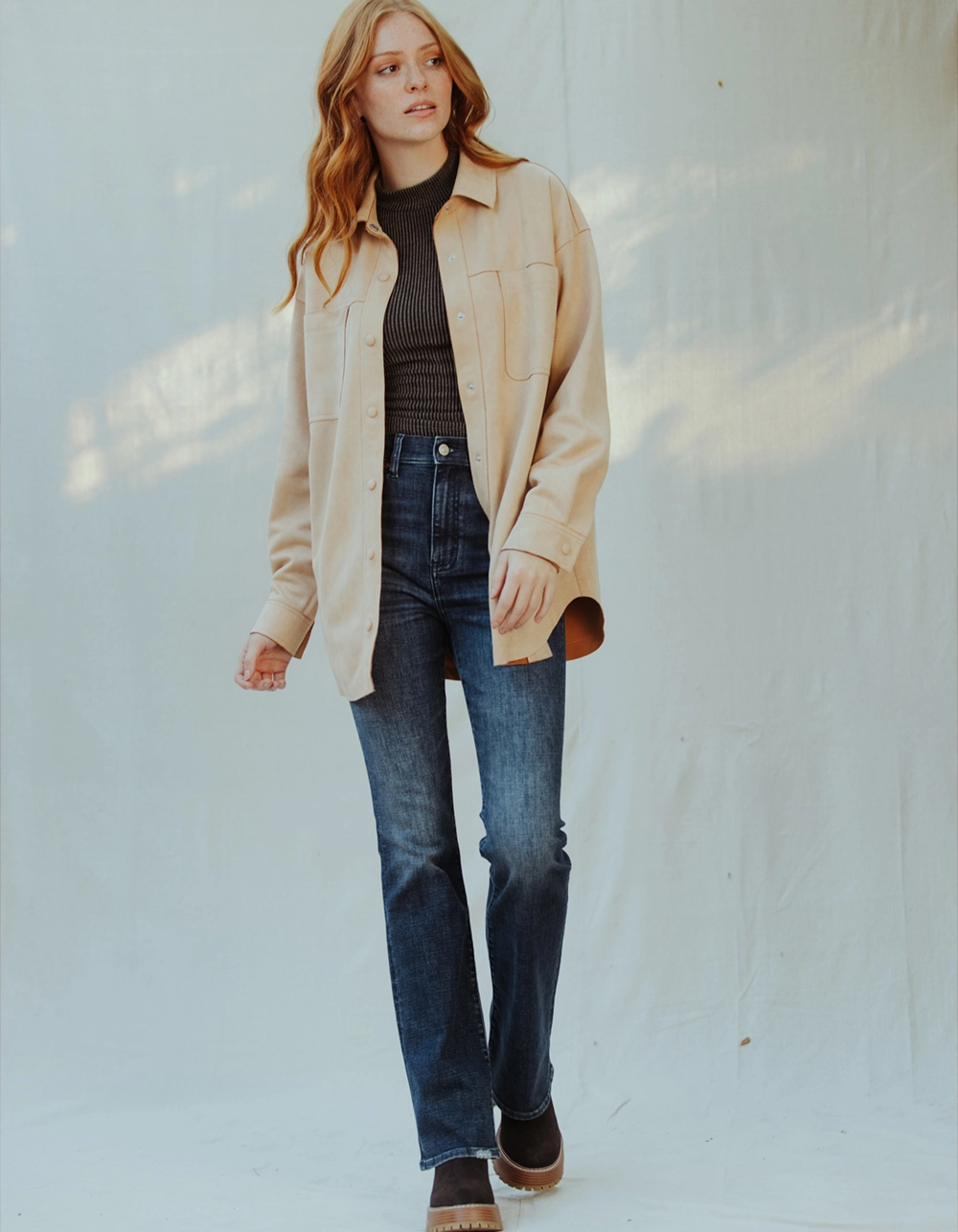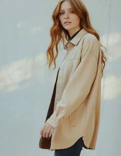 West of Melrose Suede Womens Shacket. Oversized fit. Button front. Patch pockets on chest. Slant hand pockets. Seam detailing. 92% Polyester, 8% Spandex. Hand wash. Imported.