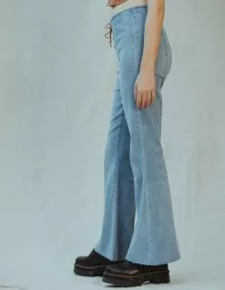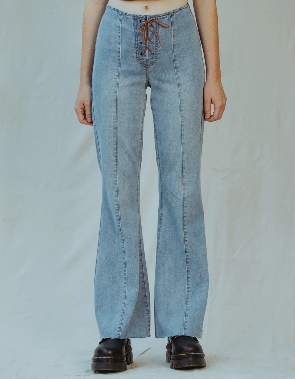 West Of Melrose Lace Up Flare Jeans. Elastic waistband. Lace up front closure. Center seam on pantlegs. Flare cut. Raw hem. 68% Cotton, 25% Polyester, 6% Rayon, 1% Spandex. Machine wash. Imported.