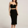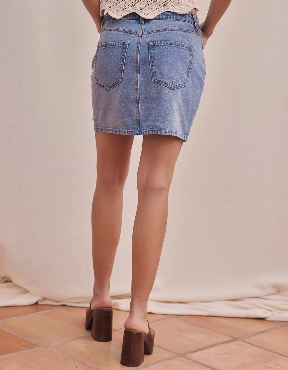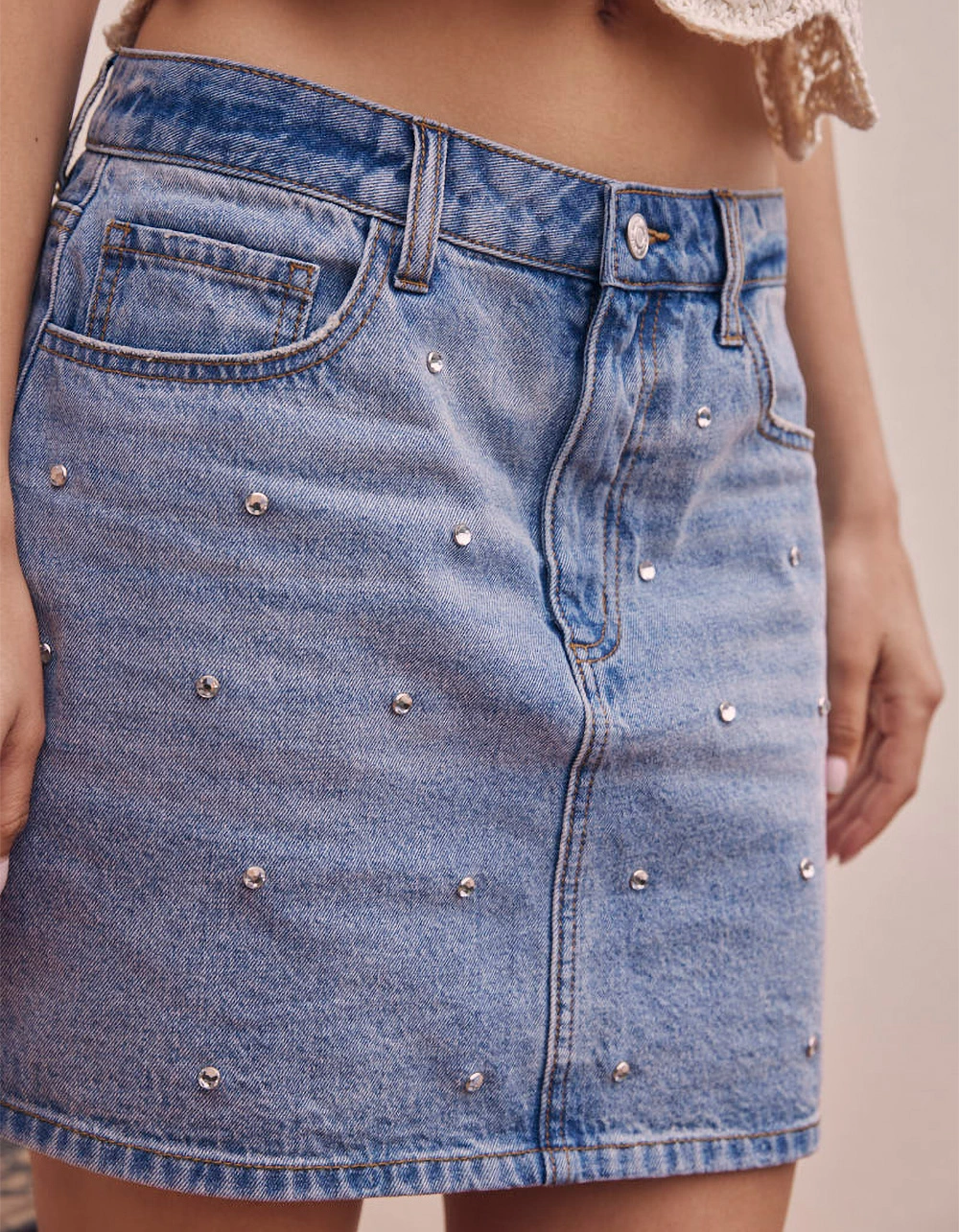 West Of Melrose Rhinestone Denim Skirt. Zipper fly and button closure. Belt loop waist. Traditional five pocket styling. Rhinestone detailing on front. Approx. length: 16”. 100% Cotton. Machine wash. Imported.