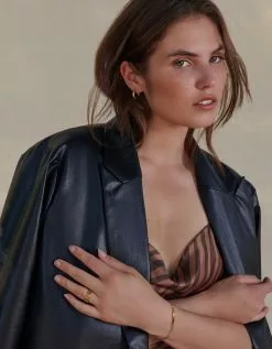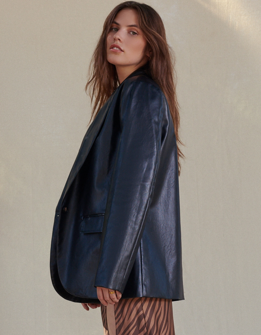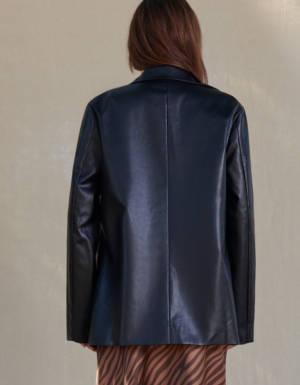 West Of Melrose Vegan Leather Blazer. Peak lapels. Single button closure. Long sleeves. Flap front pockets. Fully lined. 65% Polyurethane 35% Polyester. Lining: 100% Polyester. Machine wash. Imported.