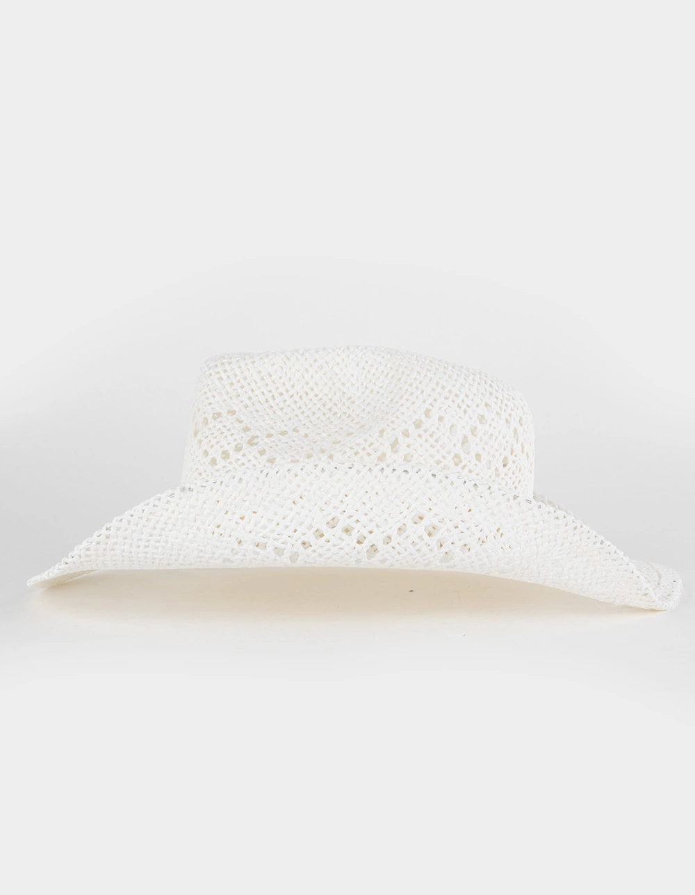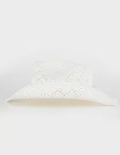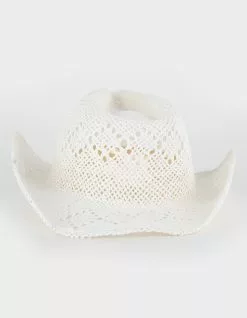 Straw Cowboy Hat. Pinch crease front cowboy hat. Wide brim. Sweatband to help wick away moisture. 100% Paper. Gentle wash. Hang dry. Imported.